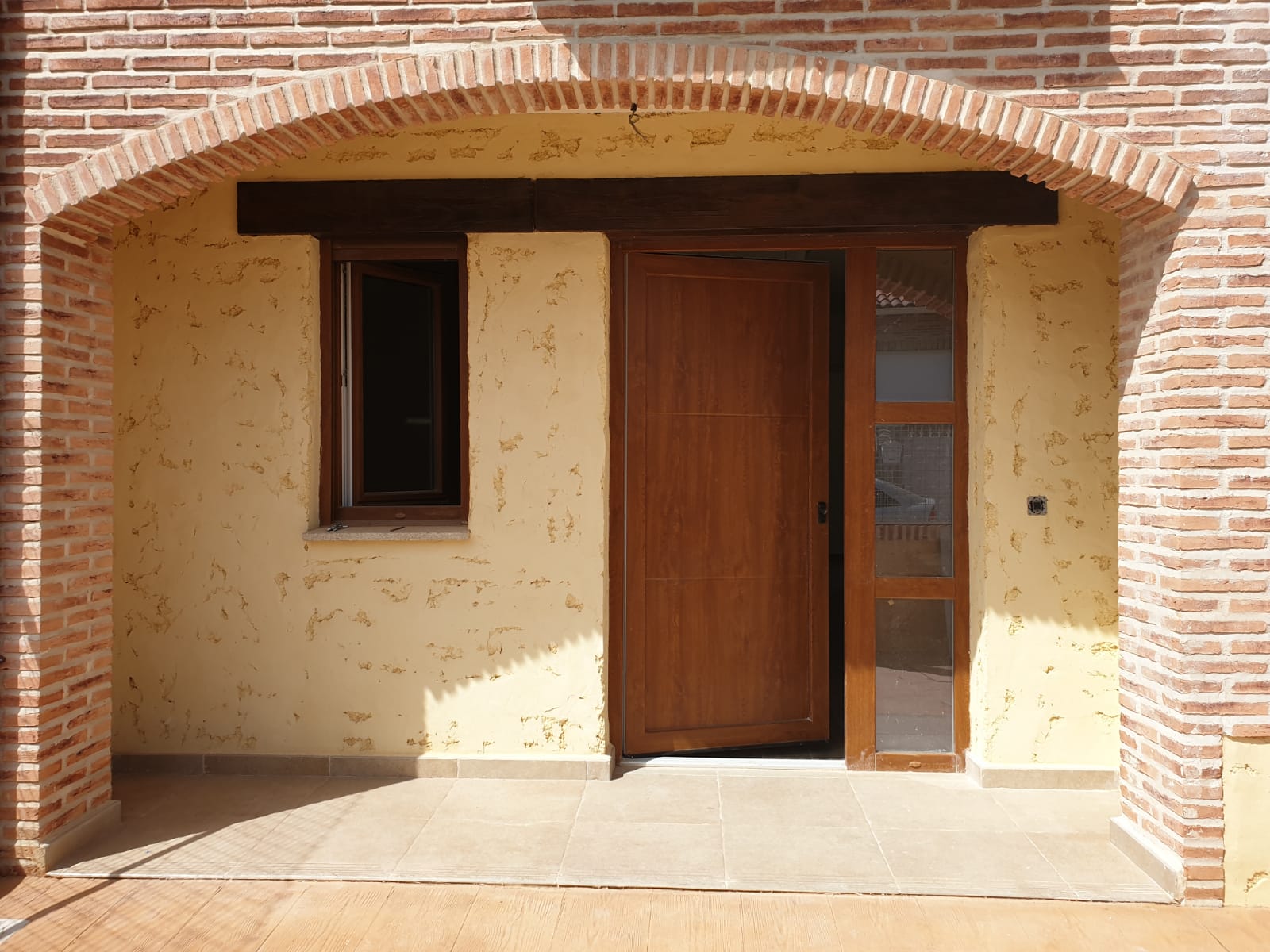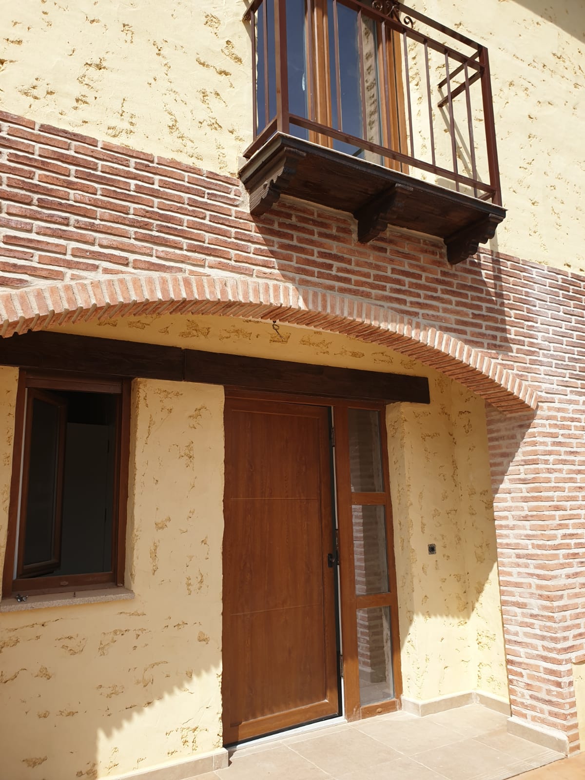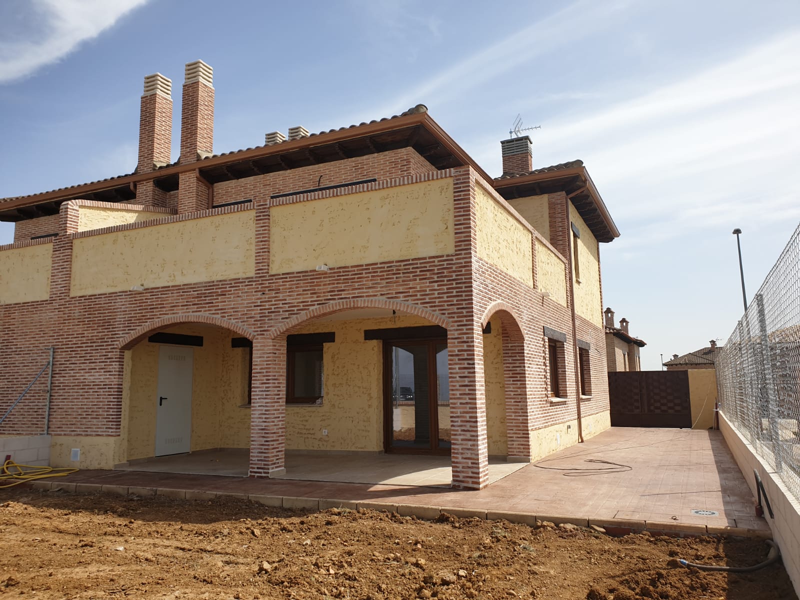 Fachada en Ladrillo árabe rustico, con aislamiento reforzado doble, cubiertas en terminación teja hormigón y con afilamiento térmico, ventanas de PVC blanco con climalit de rotura puente térmico, carpintería interior lacada en blanco, pinturas en liso, suelos en planta baja porcelánicos rectificados, con suelos en exterior en cerámico tratado, zona de parking para dos vehículos en hormigón impreso.
